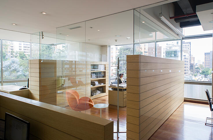 El diseño interior propuso materiales de acabado como pisos de madera, muros de vidrio y divisiones de madera de media altura, así como amplias salas de reuniones, espacios especiales para atención de clientes y oficinas de socios principales con paredes de vidrio.