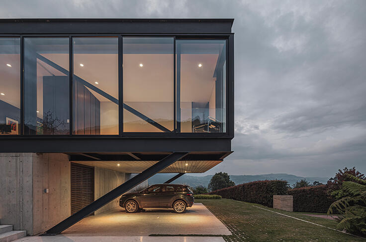 Las estrategias bioclimáticas para el confort térmico en la Sabana de Bogotá incluyen cubierta de concreto, pérgola de vidrio con efecto invernadero, ventanas de doble vidrio, piso radiante y orientación de las fachadas principales hacia el sol matutino y vespertino.2021, Guasca, Colombia. Área: 535 m²